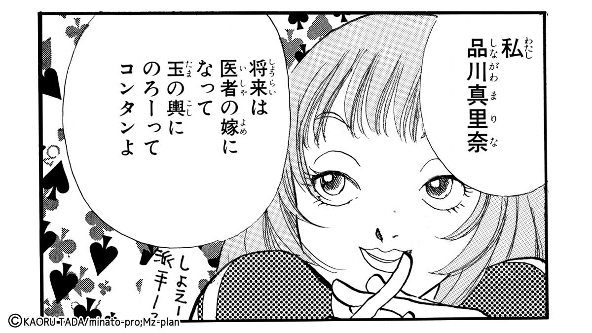 「将来は医者の奥さんになって玉の輿に乗る!」と公言する、わりきった現実派女子。はっきりした性格でサバサバしていますが、根は意外と仲間思い。